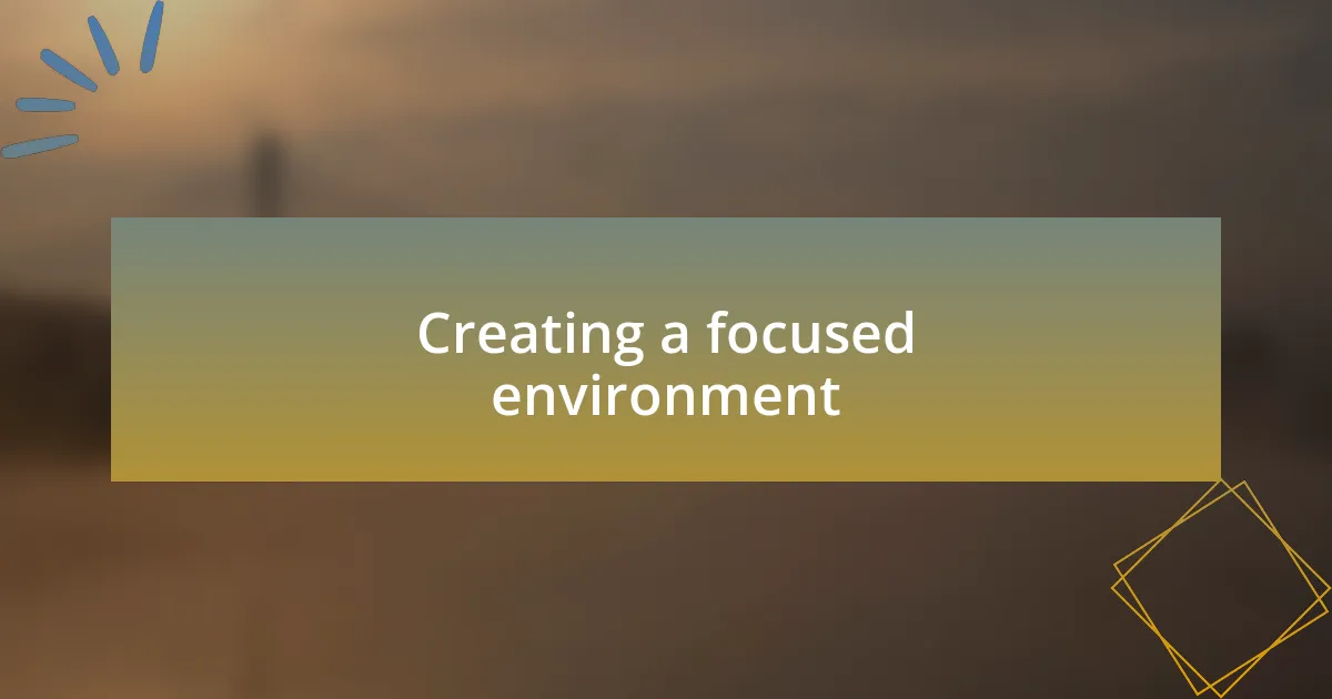 Creating a focused environment is essential for maximizing productivity. I remember when I painted my workspace with soothing colors; it completely shifted my mindset. Have you ever considered how the shades around you can influence your mood? That subtle change in my surroundings truly made me feel more centered and inspired.